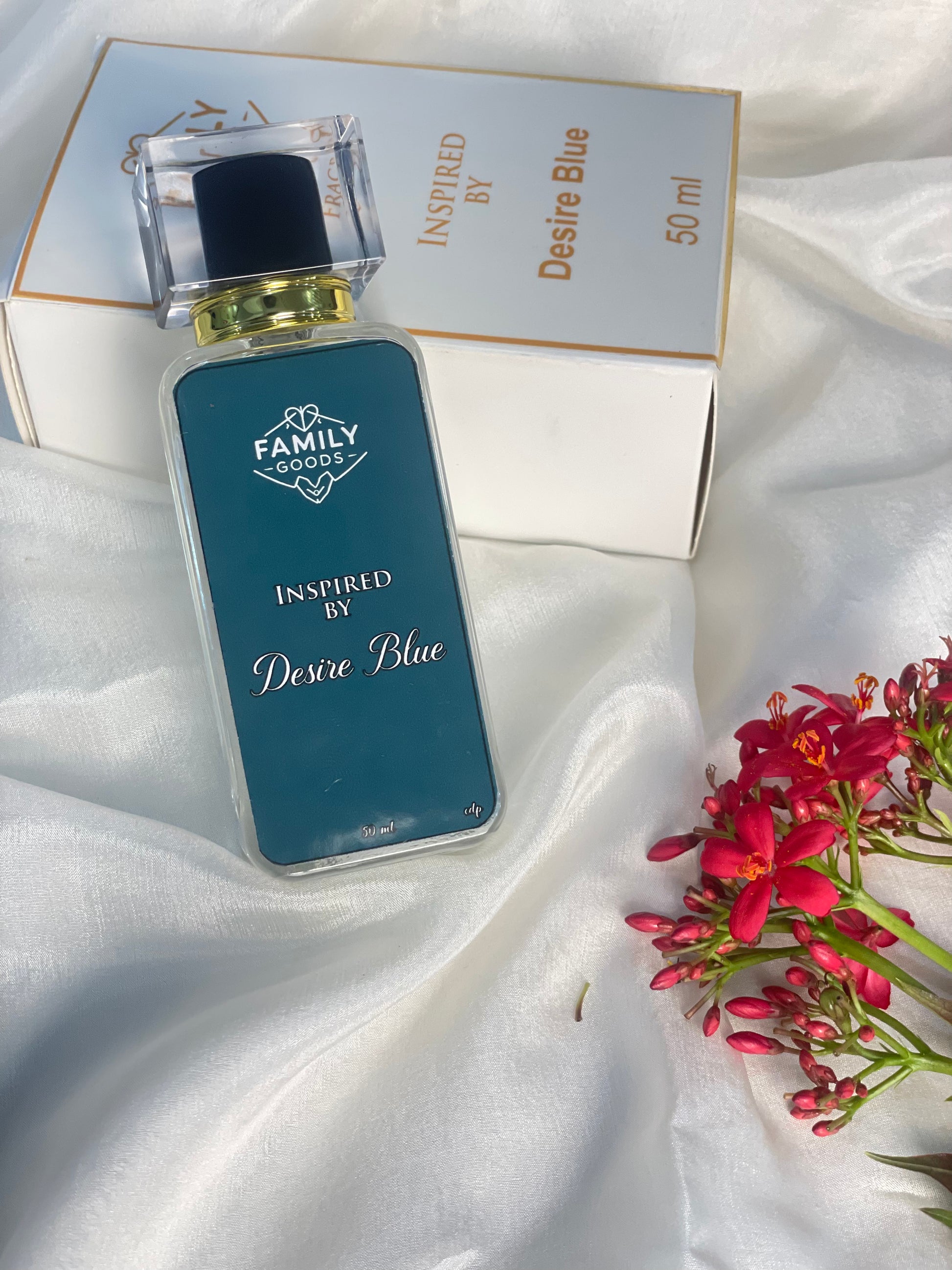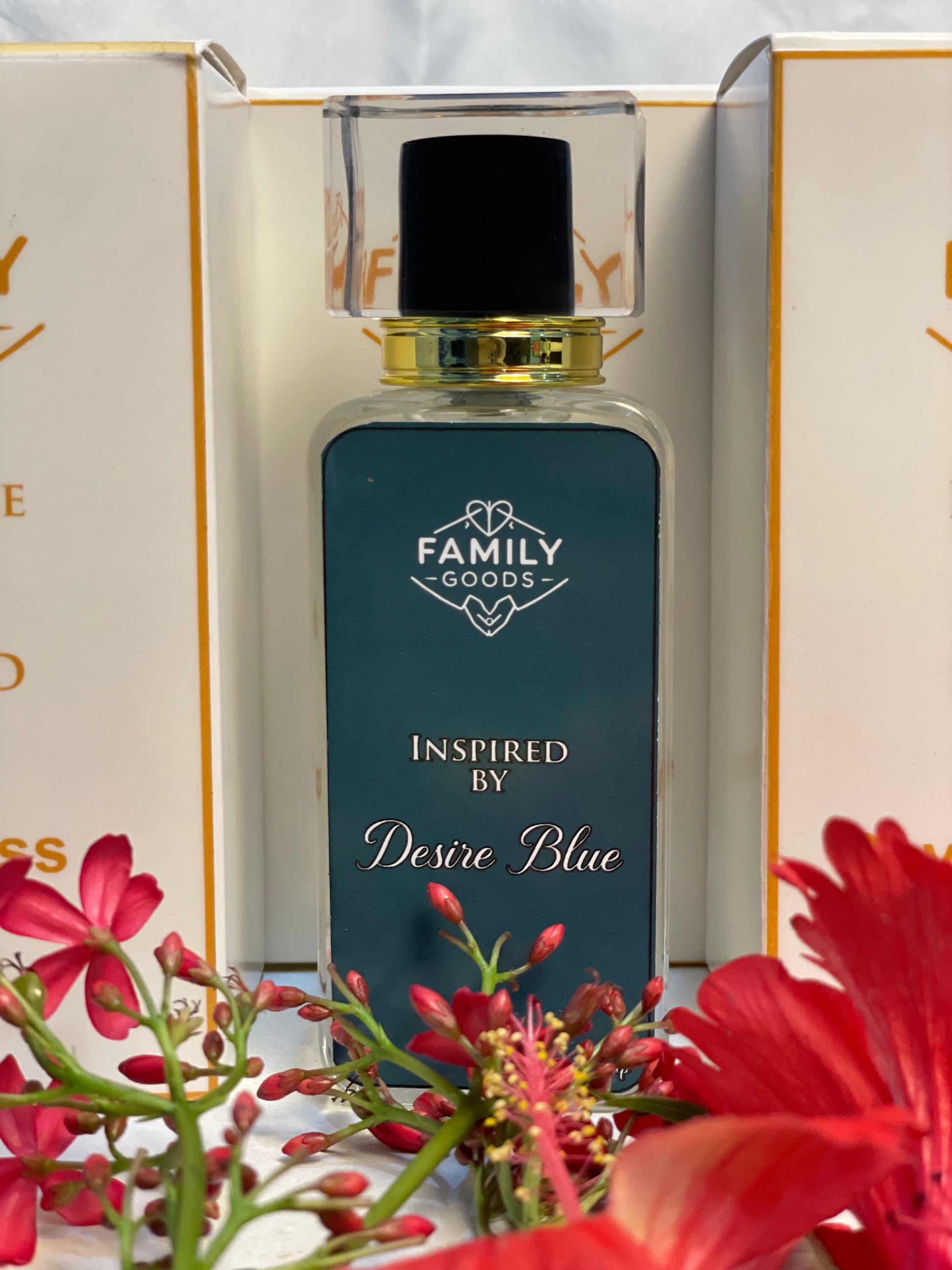 Experience the irresistible charm of Family Goods perfume inspired by Desire Blue ____ a vibrant splash of fresh citrus, oceanic breeze and sensual amber crafted for the confident man who loves to stand out, all at an unbeatable price.